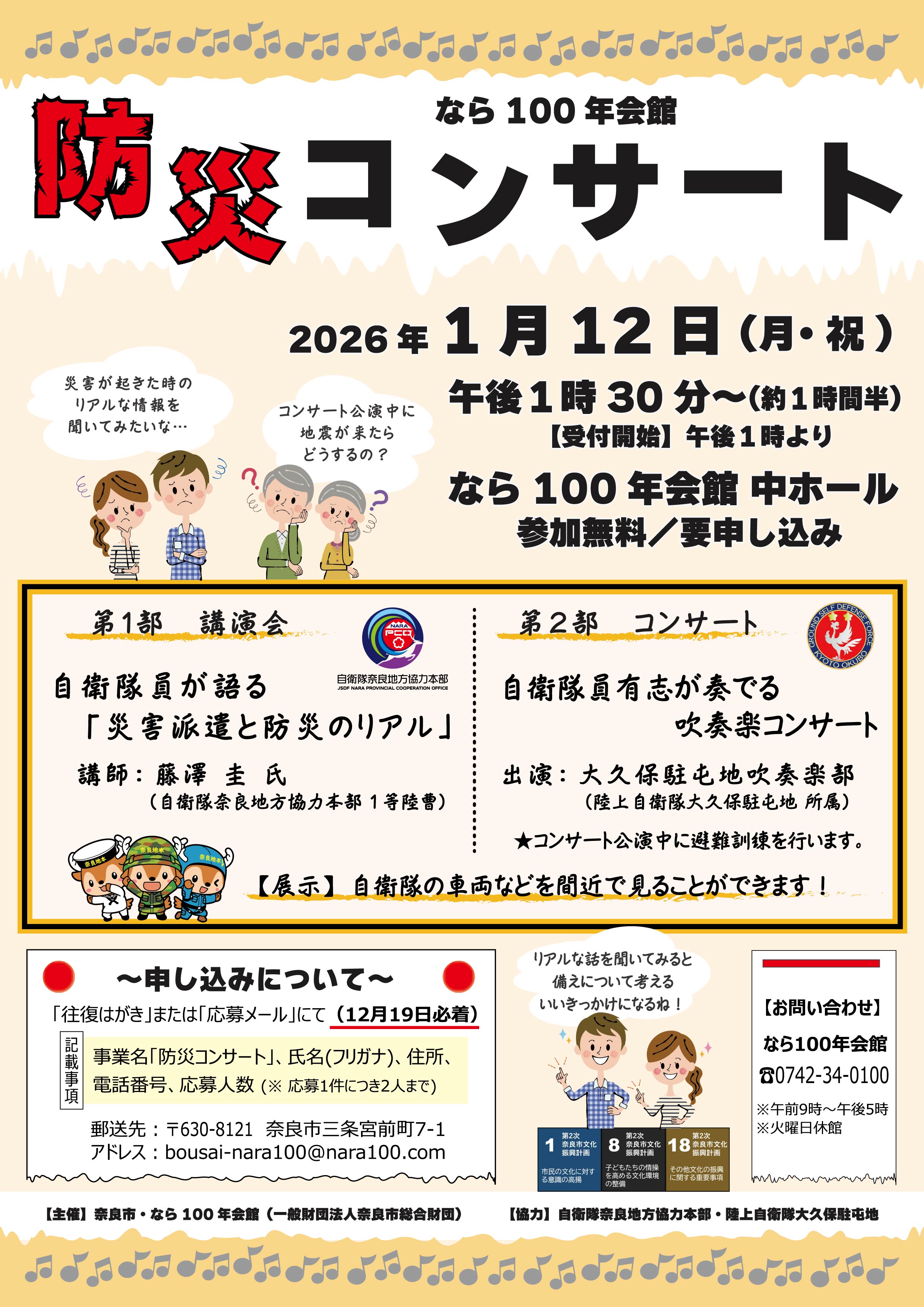往復はがき、またはメールにてお申込みください。 事業名、住所、氏名、電話番号、応募人数をご記入の上、12月19日(金)必着でお送りください。 ※応募1件につき2名まで入場可 ※応募多数の場合は抽選 【宛先】〒630-8121 奈良市三条宮前町7-1 なら100年会館 なら100防災コンサート 係 メール:bousai-nara100@nara100.com | |